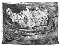 Looking at Marta’s work for this exhibition, the prints seem to divide into the opposing areas of the sublime and the demotic and form an unusual contrast of themes and techniques. The works inspired by the New Testament Book of Revelation, all of which are linocuts, are a superb response to a profound and complex text to which the artist has brought her own highly individual visual sensibility. From the medieval iconography of the Last Judgement to the melancholy figure of the Beast, there is a consistent seriousness of intention and superb mastery of the skill of linocut. The majestic and fearsome figure, Woman, is one of the most memorable of the Apocalyps images and is invested with both drama and apprehension. Four, which depicts the image of the horsemen rising above the human realm is interpreted in a manner which is wholly original, a difficult achievement with such a well known subject. All of these prints possess a pervasive atmosphere of otherworldly dignity, totally appropriate to the interpretation of a mystical topic.